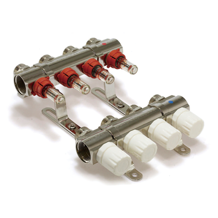 Коллекторный блок служит для распределения потоков по контурам теплого пола, где в качестве теплоносителя используется вода либо незамерзающие растворы гликоля с максимальной рабочей температурой 70 °C, рабочим давлением до 6 бар