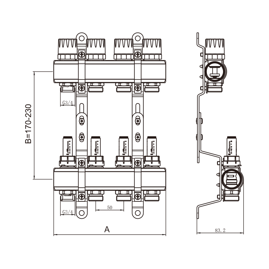Выходы от 3 до 12 с соединением 3/4” Евроконус. Межосевое расстояние: 50мм.